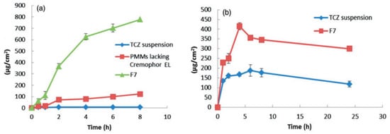 Kandekar et al. used PMs to study the selective delivery of ADA to the human hair follicle under finite dose, in order to arrange an alternative formulation with improved efficacy and reduced adverse side effects. The use of finite dose conditions in in vitro studies tends to mimic more accurately “real” conditions, as infinite dose conditions risk overestimating the amount of drug delivered in vivo. The use of smaller amounts of formulation in finite dose conditions also decreases the effect of excipients, being more representative of in vivo behaviour. The ADA entrapted in D-α-tocopheryl polyethylene glycol 1000 succinate (TPGS) PMs were prepared using the solvent evaporation method, applying acetone as the solvent.