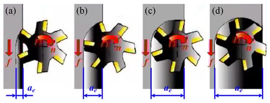 Although the machining parameters are considered in the above research, the relative position between the milling tool and workpiece is ignored. As known to all, the milling process can be divided into symmetrical milling and asymmetrical milling based on the different positions between the milling tool and workpiece when milling a plane. With respect to machinability, asymmetric milling is better than symmetric milling [21,22]. Asymmetric milling can be further divided into asymmetric up-milling and asymmetric down-milling. Figure 1a, b present how the pure up-milling as the radial depth of cut is smaller than half of the tool diameter. However, the kinematics of asymmetric up-milling changes into down-milling when the radial depth of cut exceeds half of the tool diameter, as shown in Figure 1c, d.The tool teeth cut into the workpiece from the smallest cutting thickness and is cut out from the largest cutting thickness in asymmetric up-milling, while it is just the opposite asymmetric down-milling. As a result, the tool vibration in asymmetric down-milling is greater than that of asymmetric up-milling, and the gap between the screw and the nut of the workbench should be eliminated to prevent the workbench from moving in the case of large horizontal milling force component. Favero Filho et al. [23] indicated the machining direction (i.e., up- and down-milling) generated a much more significant influence on the machinability when compared to the cutting parameters. The better machinability of up-milling processes in relation to down-milling was also found. Hence, the asymmetric up-milling was utilized for milling TC25.