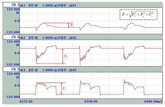 Figure 3 shows the typical cutting force signal spectrum in asymmetric up-milling. Obviously, the horizontal component of cutting force Fx is opposite to the feed direction of the workpiece, which is a characteristic of up-milling. Considering that the up-milling is an interrupted cutting process, in which the uncut chip thickness changes at any time, the cutting force changes periodically and also changes with time within a period. Hence, the maximum cutting force, rather than average cutting force, was utilized in the present study. The resultant cutting force had been widely utilized for the selection of cutting tools and the optimization of cutting parameters in milling hard-to-cut material [27,28]. Each component of cutting force only reflects one aspect of machinability, while the resultant cutting force can fully characterize the machinability. Hence, at least five periods in the cutting force signal spectrum are selected to extract the maximum value of each component of cutting force Fx, Fy, and Fz, and then the average values accordingly are used to calculate the resultant cutting force F.