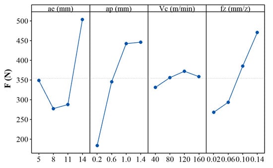 Figure 4 shows the plot of means for the maximum cutting force F. It is found that the radial depth of cut has a significant effect on the cutting force during asymmetric up-milling of TC25 alloy. In addition to radial depth of cut, the axial depth of cut and the feed per tooth also have a significant effect on the cutting force. This is because that the above cutting parameters have a direct effect on the material removal volume, which has a positive correlation with cutting force. At the same time, it was also found that the cutting speed has a slight effect on the cutting force. This is because the influence of the cutting speed on strain rate is much greater than the influence of cutting speed on strain. In this study, the increase/decrease in cutting speed is not sufficient to generate a significant change in the cutting force.