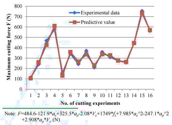Figure 5. Experimental data [L16(44)] and fitting results of maximum cutting force F.