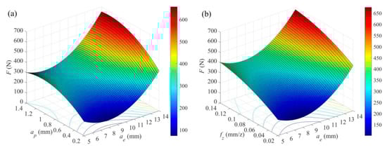 Figure 6. The interaction of (a) ae × ap (Vc = 80 m/min, fz = 0.06 mm/z), and (b) ae × fz (Vc = 80 m/min, ap = 0.6 mm) on maximum cutting force F.