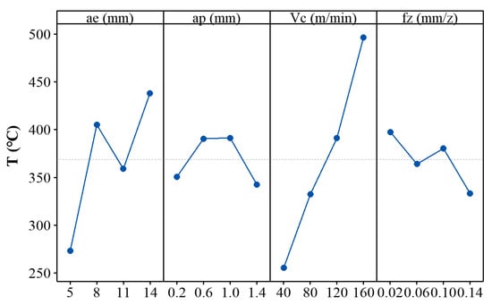 Figure 7 shows the plot of means for the maximum cutting temperature T at the cutting zone. It can be found that both the radial depth of cut and cutting speed have a significant effect on the cutting temperature. This is because the radial depth of cut as well as cutting speed determines the strain rate during the milling process, which in turn controls the cutting temperature. However, the influences of the axial depth of cut and the feed per tooth on the cutting temperature are significantly weakened. This is because the axial depth of cut and the feed per tooth are relatively small, and the corresponding effects on strain rate are weakened.