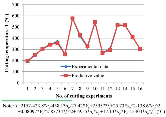 Regression prediction model between cutting temperature and cutting parameters was established based on Taguchi analysis. The fitting results are shown in Figure 8 (the corresponding ANOVA results are summarized in Table 4), which shows that the use of the quadratic regression equation has strong predictability.