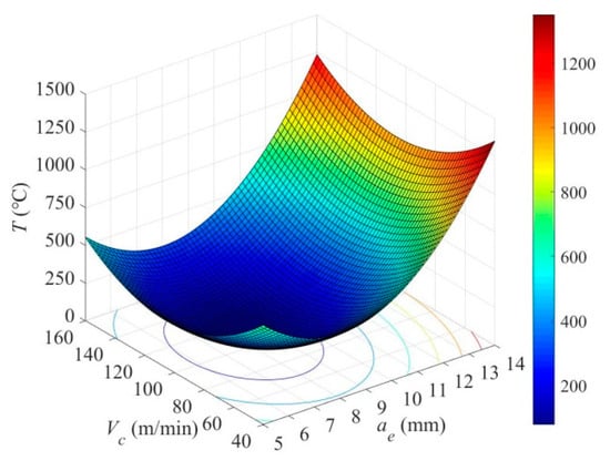 Figure 9. The interaction of ae × Vc (ap = 0.6 mm, fz = 0.06 mm/z) on maximum cutting temperature T.