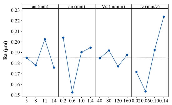 Figure 10 shows the plot of means for the machined surface roughness Ra. It can be seen from Figure 10 that the feed per tooth has the most significant influence on the surface roughness. This can be explained from the perspective of cutting kinematics. As we all know, the feed per tooth and the tool nose are the key factors that determine the profile of the machined surface, which in turn determines the surface roughness value. Following with feed per tooth, the axial and radial depths of cut also generate considerable influence on the surface roughness. As mentioned in Section 3.1, the axial and radial depths of cut determine the magnitude and direction of the cutting force, which makes the milling tool holder subject to an unbalanced radial force during the asymmetric up-milling process, and in turn, causes deflection of the milling tool or cutting chatter, thereby changing the surface roughness. The cutting speed has the smallest effect on the surface roughness. This is because the surface generation mechanism in this speed range is always plastic removal and adiabatic shearing, and there is no mechanistic change.
