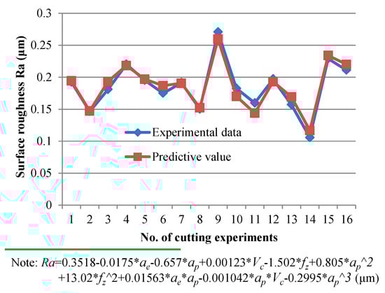The regression prediction model between surface roughness and cutting parameters was also established based on Taguchi analysis. The fitting results are shown in Figure 11 (the corresponding ANOVA results are summarized in Table 5), which show that the use of the quadratic regression equation also has strong predictability on surface roughness.