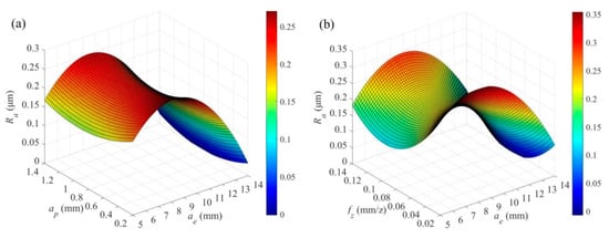 Figure 12. The interaction of (a) ae × ap (Vc = 80 m/min, fz = 0.06 mm/z), and (b) ae × fz (Vc = 80 m/min, ap = 0.6 mm) on surface roughness Ra.