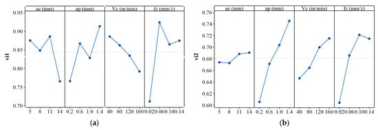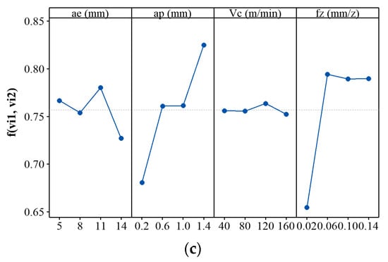 Figure 13 shows the plot of means for each evaluation quantity and the evaluation result of the machinability. Figure 13a shows that each cutting parameter has a significant impact on vi1. From the previous analysis, each cutting parameter will affect the evaluation indexes to different degrees, which are reflected as an impact on the area of radar diagram. Figure 13b shows that the influence of radial depth of cut on vi2 is significantly lower than other cutting parameters. It is indicated that a balanced development of the machinability can be reached by changing the radial depth of cut. Figure 13c shows that the machinability evaluation result is mainly affected by the radial and axial depths of cut, while the cutting speed is the least. This is mainly because the cutting speed has an opposite effect on the evolution of the area of radar diagram and the balance of various indexes.
