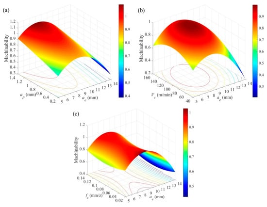Figure 15. The interaction of (a) ae × ap (Vc = 80 m/min, fz = 0.06 mm/z), (b) ae × Vc (ap = 0.6 mm, fz = 0.06 mm/z), and (c) ae × fz (Vc = 80 m/min, ap = 0.6 mm) on the comprehensive machinability.