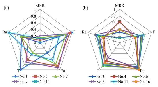 From the above analysis, contradictory results will be obtained when a different index is used for parameter optimization. In this section, radar chart is utilized for comprehensive machinability evaluation including the material removal rate MRR (i.e., Equation (1)), cutting force F, specific cutting energy Eu (i.e., Equation (2)), cutting temperature T, and surface roughness Ra, in order to optimize the cutting parameters in asymmetric up-milling of TC25.