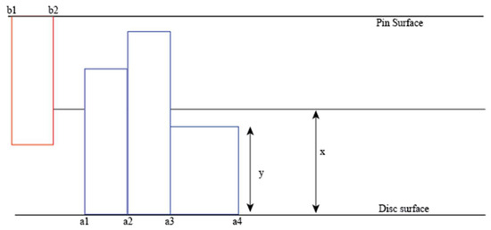 The analytical model is created to quantify the interdependence of sliding wear and sound emitted in a pin-on-disk setup as shown in Figure 1. a1, a2, a3, a4 lie on a plane on the bottom surface (surface of the disc), b1, b2, lie on a plane on the top surface (tip of the pin), y is the height of an asperity and x is the distance from either surface to the centreline axis (located at a mid-distance between the two surfaces). As the asperities on the disc are struck by the asperities on the pin, the sound can be emitted due to two mechanisms: