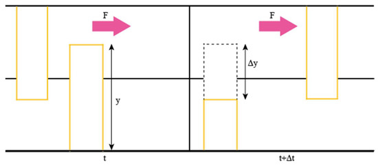 As the pin undergoes no wear, the wear function does not have to be applied to the pin. The impacts between the top asperity and the bottom asperities are represented as point impacts. Wear occurs when the impact between the asperities lead to deformation such that the total stress on the asperity exceeds the ultimate tensile strength which leads to the asperities breaking off. As such, wear can be taken as a function of deformation only W(y − x). It should be noted that the deformation of interest is due to the tangential force only. This is because the normal force will not contribute to the sound generation. This means that an asperity at a height of y at a time t, will be at a height of dy = y − Δy at time t + Δt under wear as shown in Figure 2: