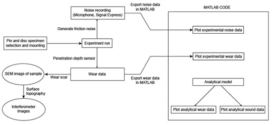 A set of SEM images are also taken after the experiments on a sample of discs. Further, interferometer images are also taken to visualise the surface roughness of the samples. The data for the sound pressure and the wear are imported into MATLAB for them to run alongside the theoretical model. Furthermore, an interferometer image is taken for some of the samples. A flowchart of the experimental scheme is shown in Figure 8: