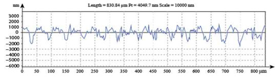 The surface roughness profile on the sample suggests that an exponential distribution is appropriate to model the asperity height distributions. As such, in the theoretical model, Φ (y, t) is assumed to be exponential and the mean value recorded by the interferometer was used in the original exponential distribution. A Gaussian distribution would be reflected by a smoother curve than the one shown in Figure 8 and the rougher the curve is, the closer it is to an exponential distribution [29]. The image from the scanning electron microscope is shown in Figure 10.