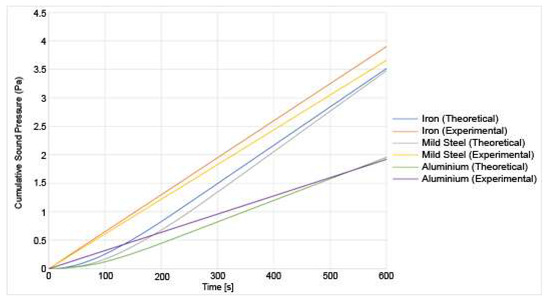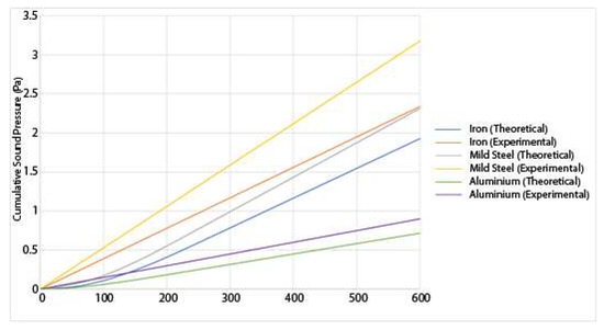 The sound pressure is recorded for each of the three materials at the two different loads, and the results for both the theoretical and the experimental results are shown in Figure 11 and Figure 12: