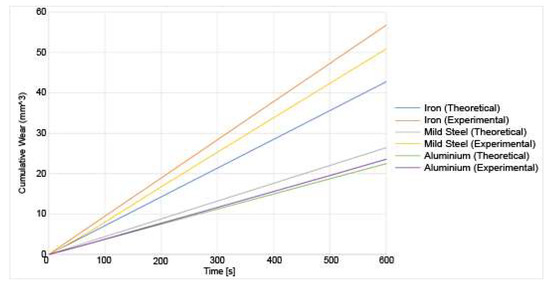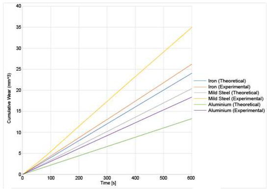 The experimental and theoretical results for the wear of the various materials and under the different loads are shown in Figure 13 and Figure 14: