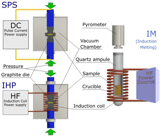 The principles of operation of SPS, IHP and IM methods is shown in Figure 1. The SPS and IHP methods use temperature and pressure to compact material. The powder material is placed in a graphite matrix, which, together with the powder, is heated by impulse current (SPS) or eddy current (IHP). Additionally, a pressure-generating force is applied to the punches of the die compressing the powder. The matrix is placed in a vacuum chamber, allowing anaerobic conditions, but this requires long flushing and pump-down times. These devices are quite large and expensive. Despite the fact that sintering takes quite a short time in both methods, much shorter than in the hot-pressing method, the time needed for preparation and cooling is several dozen minutes. The induction-melting method for densification uses both melting and crystallization. For this reason, induction melting is, in practice, applicable for congruent melting compounds. As in the IHP method, eddy currents are the source of heat, but they are generated in a small graphite crucible and directly in the melted powder. The advantage of these eddy currents is the mixing of the liquid melt, limiting the separation of the components. The powder is placed in a quartz ampoule with gas inlets, allowing it to be vacuum-filled or filled with an inert gas. Measurement and adjustment of the charge temperature are made contactless using a pyrometer, placed above the outlet of the ampoule, with a closed visor. This allows for better temperature control than in the case of SPS and IHP, where the temperature is measured with a thermocouple or with a pyrometer in a graphite die. The low heat capacity of such a system allows very fast heating and cooling rates of several thousand degrees per minute, so the process time can be very short. As a result, the growth of the grains can be limited and, in some cases, the high-temperature phase can be frozen if desired.