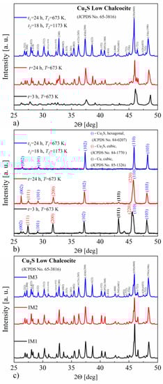 Figure 2a shows the XRD patterns obtained at room temperature for the Cu2S specimens. All obtained samples consist mainly of the monoclinic Cu2S phase. As can be seen, extending the synthesis time and increasing the temperature allows obtaining a better-crystallized form of the material. The precipitations of other phases, including copper, are not visible on the recorded diffraction patterns, which may be due to a large number of reflections in the monoclinic Cu2S phase. Larger differences between the samples are revealed in the XRD measurements at the temperature of 493 K, i.e., above the phase transition temperature of the Cu2S monoclinic to hexagonal phase [7,17] (Figure 2b). There is a clear difference in phase composition between the samples obtained at 673 K and the sample also annealed at 1173 K, which comprises the pure hexagonal copper sulfide phase. The samples obtained by annealing at 673 K contain two Cu2S phases—cubic and hexagonal. Additionally, the presence of copper can be observed, the amount of which clearly decreases with increasing synthesis time. After induction melting of the synthesized Cu2S, the XRD studies presented in Figure 2c show that, at room temperature, the resulting materials still consist mainly of a monoclinic phase. For samples IM1 and IM2, the observed XRD patterns reveal a much better crystallinity of the obtained material relative to the post-synthesis state, equal to that of sample IM3.