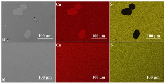 Figure 3 shows the cross-sections of the samples, which confirm their high degree of densification, with no visible pores or voids. For a sample annealed for 3 h at 673 K, the fracture resembles a glassy material, while a sample annealed at 1173 K shows the features of a polycrystalline material. The EDS analysis (Figure 4) confirms the results of the XRD measurements. The ratio of Cu to S is close to 2:1 and is fairly homogeneous over the whole analyzed area. Similarly to XRD measurements, Cu precipitates are observed in samples synthesized exclusively at 673 K. These observations show that the induction melting process is so fast that the kinetics of the processes occurring in the melt are too slow to homogenize the melted and crystallized material. This indicates the necessity of using well-reacted and homogenized Cu2S as a starting material in this type of densification method, which, as we have shown, can be achieved by allowing a sufficiently long 24-hour synthesis stage at 1173 K.
