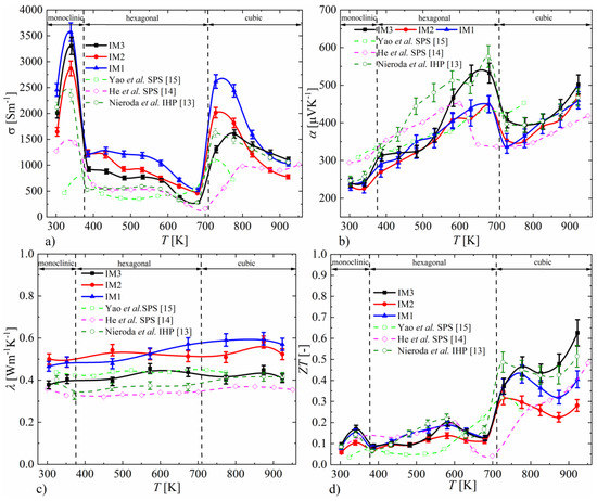 The thermoelectric figure of merit, ZT (Figure 5d), similarly to electrical conductivity and the Seebeck coefficient, noticeably changes during phase transitions between individual Cu2S structures. For the monoclinic and hexagonal phases, the ZT values vary between 0.05 and 0.2. A several-times-higher ZT of Cu2S is observed after transformation to the cubic phase. The temperature dependence of ZT for the cubic phase is non-monotonic. As the temperature increases, the ZT decreases, reaching a minimum at a temperature dependent on the method of synthesis, after which it increases. In the case of samples IM1 and IM2, this minimum is at a temperature around 870 K, and the maximum ZT value is reached at a temperature below this minimum except in the cubic phase. For sample IM3, the ZT minimum for the cubic phase is at around 820 K; the maximum ZT value is observed at 920 K and reaches around 0.6, which is the highest value for all samples obtained in this work. The improved thermoelectric properties of sample IM3 with respect to samples IM1 and IM2 are mainly due to the lower thermal conductivity and the smaller decrease in electrical conductivity with increasing temperature. These more favorable properties are related to the greater homogeneity of the material synthesized at 1173 K, expressed by the absence of copper precipitates and the more favorable, more stoichiometric composition of Cu2S. The temperature dependence of ZT, determined for the materials obtained by induction melting, is similar to the results presented in the literature [13,14,15]. The most comparable properties can be observed for the sample obtained by IHP sintering in our previous studies [13], which has a very similar temperature dependence and values of ZT as for the IM3 sample. However, the thermoelectric properties are better than those of SPS-densified samples synthesized both by direct high-temperature synthesis and by mechanical alloying, which may be due to their degradation during the SPS process resulting from the current flow through the material.