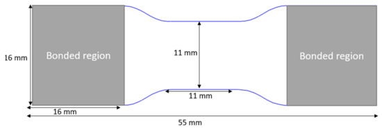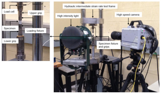 Transverse tensile tests at intermediate strain rates were conducted on a custom-built hydraulic test frame (Figure 2) comprising a 13.3 kN load cell and a hydraulic actuator with a 101.6 mm stroke. The upper specimen grip was mounted to the load cell on the stationary upper crosshead. The lower specimen grip was mounted to a fixture on the actuator piston, which utilized a slack adaptor to provide sufficient time for the hydraulic piston to accelerate to the desired speed before engaging the specimen. Dog bone specimens (Figure 3) were bonded to the grips using Loctite® 480 adhesive, which is a one-part ethyl cyanoacrylate instant resin. All tests were performed under displacement control conditions at two loading rates, 20 mm/s and 1300 mm/s. Each test specimen was speckled with a black-on-white paint pattern to facilitate strain measurements using a DIC software GOM Correlate (GOM, Brunswick). The deformation response of the specimen surface was obtained from the images captured by a high-speed camera, FASTCAM SA-5 (Photron, Tokyo). The images were captured with image resolution of 256 pixel × 408 pixel (0.063 mm/pixel × 0.061 mm/pixel) at 10,000 frames/second and 54,250 frames/second for the 200 mm/s and 1300 mm/s tests, respectively.
