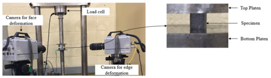 Intermediate strain rate transverse compression tests were performed using a custom hydraulic test frame (Figure 4), with a 25,000 lbf (111,206 N) load cell. Compression platens were used to compress the test specimens with a displacement rate of 2 mm/s. Each specimen was machined using a titanium carbide bit to ensure the loading ends were flat and parallel. The nominal dimensions of the test specimens were 10 × 10 mm. Before loading, a thin layer of a high-pressure grease (molybdenum sulphide) was applied to the loading ends of the specimens to reduce friction between the specimen and platens. Two FASTCAM SA-5 high speed cameras were used to capture the specimen deformation for subsequent strain measurement, one focused on the surface and the other on the edge of the specimen. A frame rate of 2,500 frames per second with an image resolution of 384 × 592 pixel2 (0.026 mm/pixel × 0.017 mm/pixel) was selected to capture the images for both cameras. The images obtained from the edge of the specimens were also used to compute the extent of out-of-plane bending and the fracture angle.