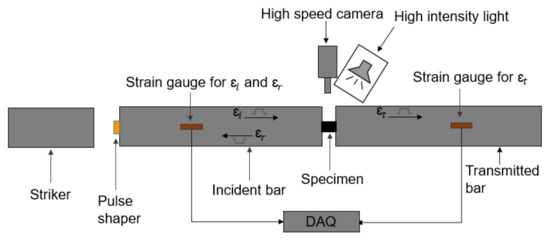 In this study, the SHPB apparatus consisted of 25.4 mm diameter maraging steel bars (Figure 6). The striker bar was 0.6 m long, while the incident and transmitted bars were each 2.4 m long. An oxygen-free high conductivity (OFHC) copper pulse shaper of 0.5 mm thickness and 7 mm diameter was used to achieve dynamic equilibrium and a nearly constant strain rate during the tests. The pulse shaper was identified on the basis of the pulse shaping analysis (PSA) proposed by Nemat-Nasser et al. [18].