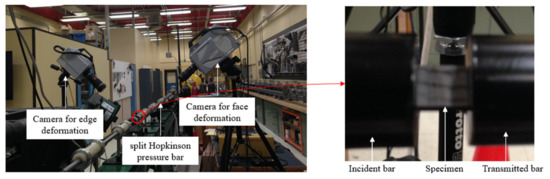 Two high-speed cameras, a FASTCAM SA-Z and a FASTCAM SA-5, were used to track deformation of the specimen (Figure 6). The strains were measured using a DIC software, GOM Correlation, with images captured by the FASTCAM SA-Z camera with a frame rate of 240,000 frames per second and an image resolution of 256 × 184 pixel2 (0.039 mm/pixel × 0.054 mm/pixel). The FASTCAM SA-5 camera was used to capture the edge deformation using a frame rate of 100,000 frames per second and an image resolution of 320 × 192 pixel2 (0.031 mm/pixel × 0.02 mm/pixel).