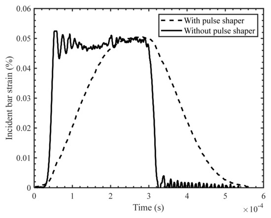 Figure 7. Incident bar strain pulse with and without pulse shaper.