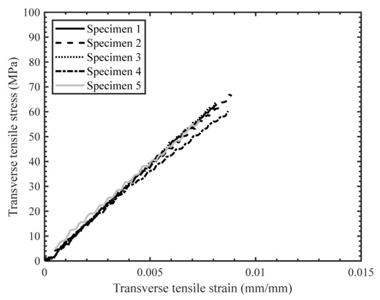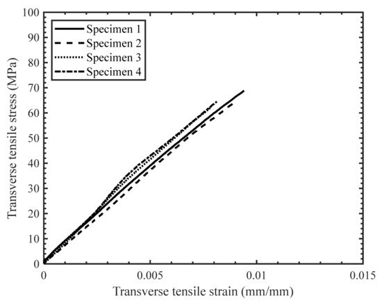 Figure 8. Stress-strain response for transverse tension tests with a strain rate of 2.2 × 10−4 s−1.