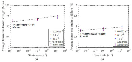 Figure 12. (a) Average transverse tensile strength versus strain rate, and (b) average transverse tensile strain–to–failure versus strain rate with regression lines shown.