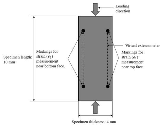 Figure 15. A schematic diagram showing the side view of a specimen used for the high rate (at 325 s−1) transverse compression testing. The dots were marked near the top and bottom faces of the specimen to obtain strains for computing the bending percentage.