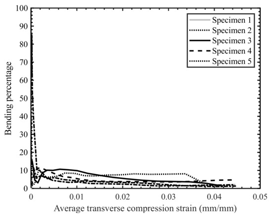 During uniaxial compression tests, flat specimens may excessively bend and fail prematurely due to the macro-buckling, rendering the data inaccurate, including the compressive strength. Therefore, for a compression test to be valid the percent bending should be within a limit of 10% as per ASTM D3410 [19], which can also be adopted for dynamic tests. The bending percentage is calculated as