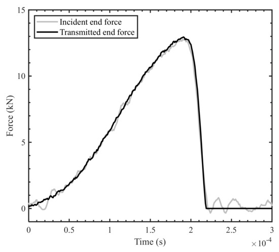 Figure 17. Force comparison at the incident and transmitted bar ends for a high strain rate transverse compression test.