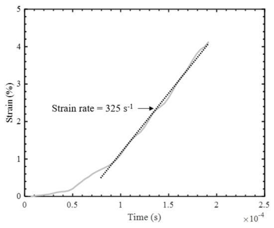 For the high strain rate tests conducted on the SHPB apparatus, it was also necessary to confirm that dynamic equilibrium was achieved and that the strain rate was nearly constant to ensure reliability of the data. After the initial loading period, the measured incident bar end and transmitted bar end forces were consistent throughout the duration of the tests within 10% (Figure 17), which indicates that dynamic equilibrium was established for all conducted tests. Furthermore, the strain was found to increase linearly with time after the initial loading period, allowing a nearly constant strain rate to be calculated on the basis of the slope of the linear region of the strain-time plot (Figure 18).