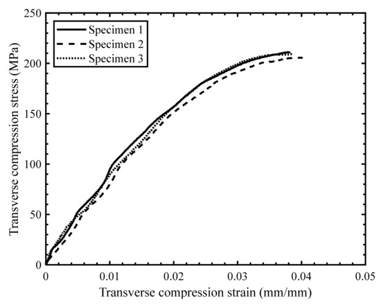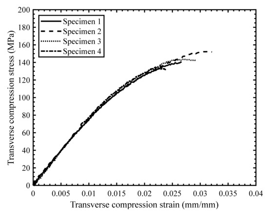 Figure 19. Stress–strain response for transverse compression tests with a strain rate of 0.003 s−1.