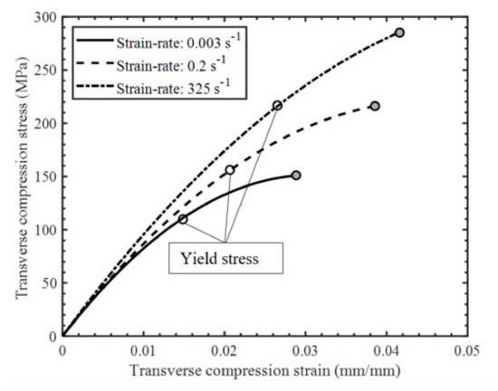 Figure 20. Stress–strain response for transverse compression tests with a strain rate of 0.2 s−1.