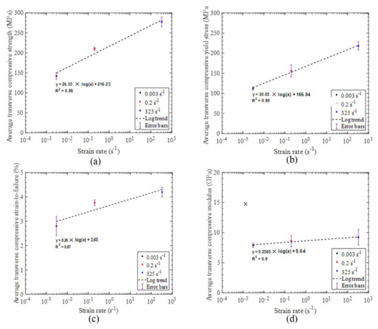 Figure 23. (a) Average transverse compressive strength versus strain rate. (b) Average transverse compressive yield stress versus strain rate. (c) Average transverse compressive strain–to–failure versus strain rate. (d) Average transverse compressive modulus versus strain rate with regression lines shown.