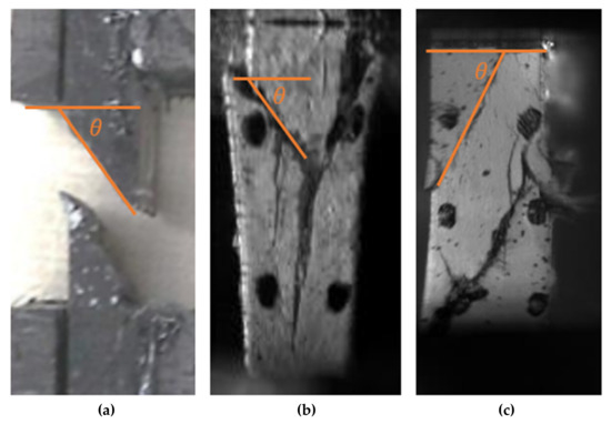 Figure 13. Images of failed transverse tension specimens at strain rates of (a) 0.0002 s−1, (b) 0.1 s−1, and (c) 16 s−1. Note that the images in (b,c) were obtained with a high-speed camera.