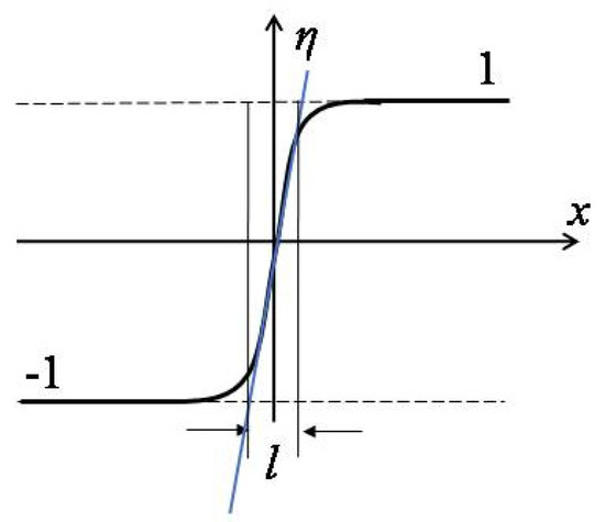The aim of the lattice phase field model is to connect the simulated grid spacing with the lattice parameter of real materials. First, let us see how to determine the real value of the grid size in the phase field model. One of the most key advantages of the phase field model is that this model avoids tracking phase boundaries during microstructure evolution, and interfaces can generate, disappear, or move according to changes in the total free energy of the material [4]. A schematic plot of the interface between two order parameters is shown in Figure 1. The average interfacial energy density, or average gradient energy density, for this simple model can be written as [4,14]