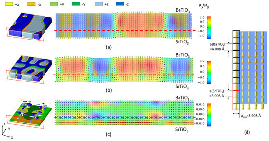 The simulated superlattice ferroelectric domain structures (left) and the vector plot of polarization in the cross-section plane (right): (a) under the fully commensurate condition, (b) under a partially relaxed condition, and (c) under the fully relaxed condition. (d) A detailed vector plot of (a) with lattice grids. Please note the grid spacing Δx1 = Δx2 = asup, Δx3 = 3.905 Å forthe SrTiO3 layer, andΔx3 = 4.008 Å for the BaTiO3 layer.