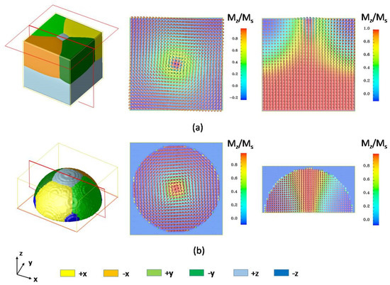 where K1, K2 are anisotropy constants, mi = Mi/Ms, A is called the exchange coupling constant, μ0 is the vacuum magnetic permeability, Hd and Hex are the demagnetization field and external magnetic field, and V is the representation volume. With all the energetic contributions, the evolution of the ferromagnetic domain structure can be obtained by solving Equation (7) using the Gauss–Seidel projection method [20].