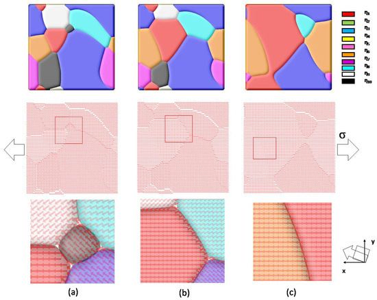 Figure 4a–c illustrate the evolution of multi-grain material at a tensile stress of 10 MPa after 5000 steps. The order parameters η1~η10 represent grains with a given crystallographic orientation. In this 2D simulation, a vector of constant length denotes the angle between the grain direction and the x-axis. Under tensile stress along the x-direction, one can see that grain boundary migration occurs, the evolution of simulated grain structure reveals that the energetically favorable grain starts growing, and unfavorable orientated grain disappears. It is also interesting to note that a small-angle-grain-boundary is observed between the red-colored grain (with a misorientation angle of 0°), and orange-colored grain (with a misorientation angle of 2.88°), as shown in Figure 4c. This grain boundary almost keeps static, since the elastic energy contributions of neighboring grains are similar under applied stress. This multi-grain model also can be integrated with the previous ferroelectric/ferromagnetic models to study the physical properties of nanoscale multi-grained materials.