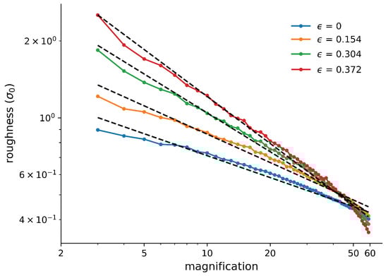 Log-log plot of the roughness versus magnification for different strains. The Hurst exponent is the exponent of the power-law dependence. High compression leads to higher roughness as well as an increase in the Hurst exponent. Details on how the roughness was calculated and how the magnification was defined can be found in Section 2.2.