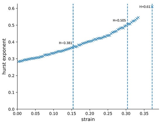 The Hurst exponent of the surface roughness of the compressed polymer sample as a function of the strain. The Hurst exponent continued to increase with increasing strain, rather than levelling off to a constant value, as it has been shown to do in metallic materials [9]. The dashed lines are here to underline the values of the Hurst exponent at different strains.