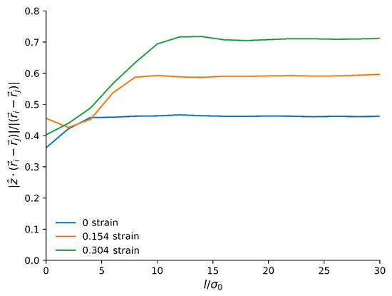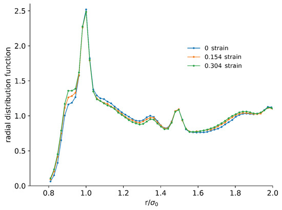 We first characterised the structure using the radial distribution function (RDF), which is shown in Figure 6. The large peak around 1.0 corresponds to the bonds inside the polymer chain and was not changed significantly during compression, as we did not allow for bond breaking. At shorter distances, around 0.9, there was a shoulder that resulted from non-bonded monomers approaching each other quite closely. This increased in height with increasing strain. Correspondingly, the density decreased at the slightly longer distances in the range of –. Further out, there was an increase. However, the peaks remained in place and were qualitatively similar. These changes in the RDF are indicative of distortion in the material but not any dramatic structural changes.