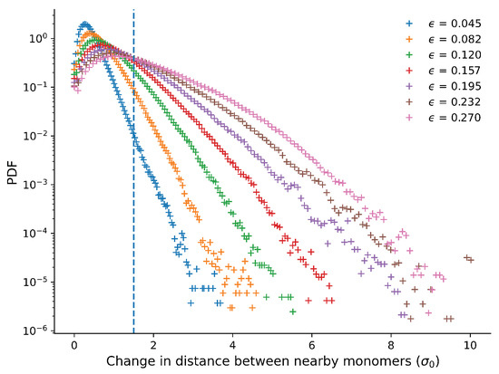 We also considered the rearrangements in the structure that occurred during the compression. In general, a power-law distribution of rearrangements would be expected to be linked to avalanches in rearrangements [20,21,22], as well as self-affine roughness profiles [9]. We therefore investigated the displacement of monomers from their environment. While we would not expect long-range power-law behaviour here, due to the finite size of our simulation box, we did not observe any power-law at all (see Figure 10). This may be related to the fact that the displacements are in fact within the length of the polymer, and any power-law rearrangements would have to include the entire chain.