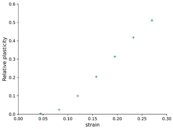 Relative plasticity, i.e., the fraction of monomer pairs that displayed plastic local changes. We defined plasticity in terms of the change in distance between monomers. The change in distance was recorded between two states with a 0.0375 difference in strain. A pair of monomers was considered to have moved plastically if the change in the distance between them is more than .