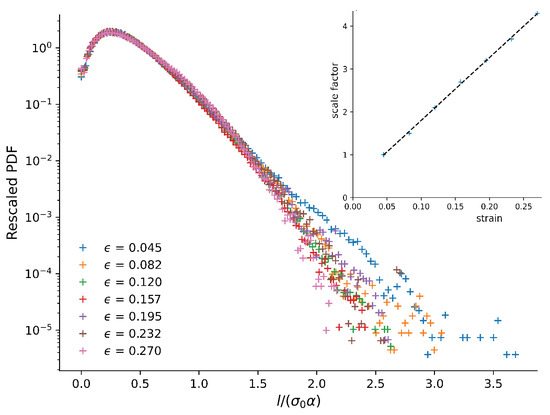 To investigate if the nature of the plasticity changed significantly during the compression, we considered the shape of the distribution of nodal displacements. We rescaled the nodal displacement and distribution shown in Figure 8 by a scale factor that is linear in the strain. We obtained this linear function by considering the nodal displacements corresponding to the maximum in the PDF and fitting a linear function, which gives . The result is shown in Figure 10. For the most common displacements, the curves fall neatly on top of each other. However, the curve for the small strain is different from the others, as expected from the fact that at small strains, elastic deformation dominates, while at larger strains, both elastic and plastic deformation occur.